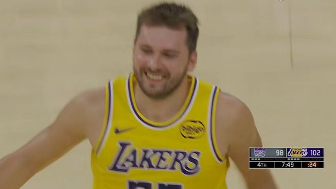 中鋒防東契奇?移動(dòng)速度太慢,后衛(wèi)防東契奇?體重頂不住,鋒線防東契奇?技巧差太遠(yuǎn),難怪盧卡在賽后板凳席上也是哈哈大笑,包括被換下場(chǎng)的時(shí)候都是一臉笑容的,你能夠感覺(jué)到盧卡這場(chǎng)比賽是打爽了打開心了,手上有球了,明顯就很高興。