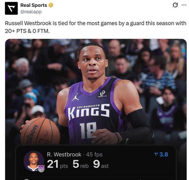 在德羅贊失準(zhǔn)、拉文和小薩缺席的情況下,國(guó)王隊(duì)能夠拿下勝利,威少無(wú)疑是第一大功臣,全場(chǎng)威少16中8,三分9中5高效拿下21分5板9助1斷。