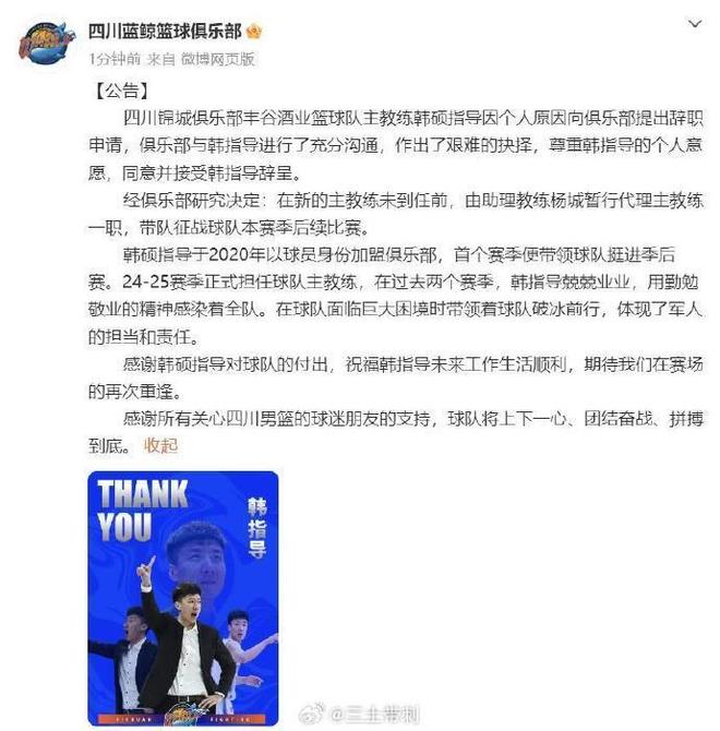 北京時間1月22日,四川男籃在開局17連敗聯(lián)賽墊底后,如今四川男籃官方發(fā)布公告,球隊主帥韓碩指導(dǎo)因個人原因向俱樂部提出辭職申請,俱樂部同意并接受韓指導(dǎo)辭呈,由助教暫時承擔代理主帥職責。