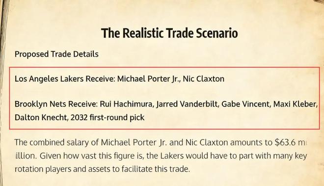 美媒《Fadeaway World》撰文建議,湖人可以將八村壘、范德比爾特、文森特、克萊伯、克內(nèi)克特以及2032年的首輪簽送到籃網(wǎng),換回前鋒小波特和內(nèi)線克拉克斯頓。