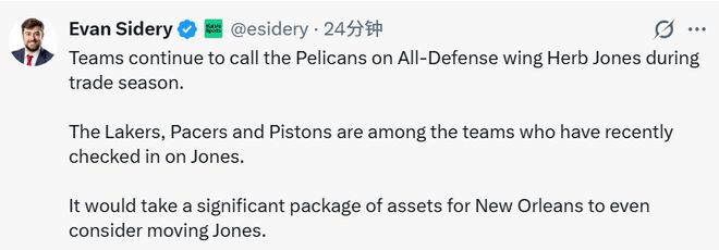 北京時間1月24日,據(jù)名記Sidery報道,交易窗口期,多支球隊持續(xù)向新奧爾良鵜鶘隊詢價全明星級防守側(cè)翼赫伯特-瓊斯。洛杉磯湖人、印第安納步行者以及底特律活塞均在近期就瓊斯的交易可能性,向鵜鶘隊進行了咨詢。想要讓鵜鶘隊認真考慮放走瓊斯,對方必須拿出一份包含大量優(yōu)質(zhì)籌碼的交易方案。