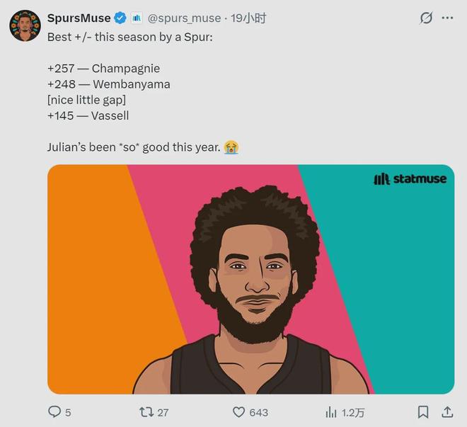 馬刺媒體SpursMuse曬出一組數(shù)據(jù):尚帕尼+257高居隊內(nèi)第一;文班亞馬+248排名第二;瓦塞爾+145,馬刺隊內(nèi)第三。尚帕尼本賽季場均正負值+5.7,聯(lián)盟第17,同樣是馬刺隊內(nèi)第一;瓦塞爾+4.5,聯(lián)盟第26,隊內(nèi)第二。