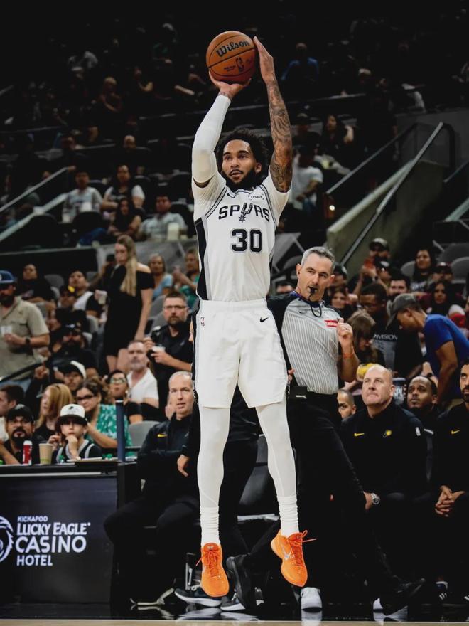 2024-25賽季,尚帕尼為馬刺打了82場,其中29場首發(fā)。場均出戰(zhàn)23.6分鐘,得到9.9分3.9籃板1.4助攻0.7搶斷0.9失誤,三項命中率:41.5%,37.1%,90.4%。本賽季尚帕尼可以說是全面進化,而且他才24歲,還有進步空間。