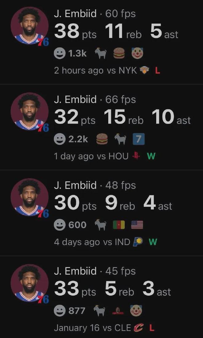 恩比德近期的狀態(tài)不可阻擋,已連續(xù)四場(chǎng)得分30+,分別轟下33分、30分、32分和38分,夢(mèng)回自己的MVP(22-23賽季)時(shí)期。