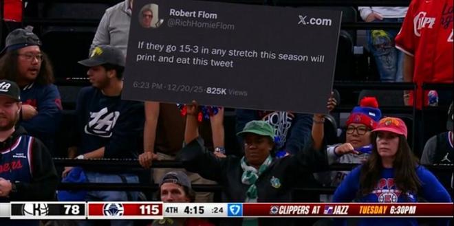 結(jié)果快船隊(duì)如今做到這一壯舉,快船主場(chǎng)球迷也將這一推文打印后直接曬照點(diǎn)名鍵盤俠。