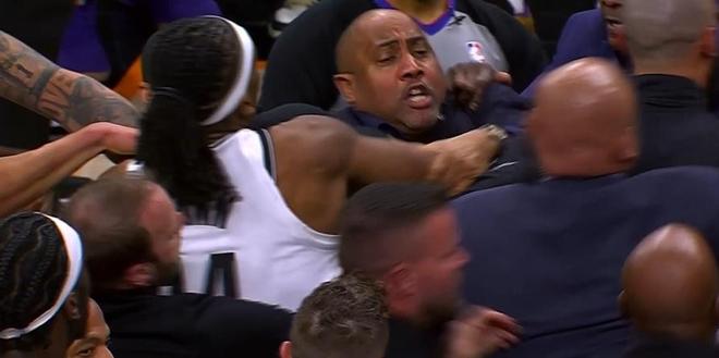 進(jìn)入第四節(jié)比賽,太陽(yáng)內(nèi)外開(kāi)花擴(kuò)大88-77領(lǐng)先優(yōu)勢(shì),籃網(wǎng)連追3分,鄧恩三分命中。籃網(wǎng)內(nèi)外開(kāi)花一波19-5攻勢(shì)反超4分,馬威連得4分追到100-100,扎威兩罰全中。阿倫上籃與狄龍兩罰全中反超2分,奧尼爾與曼恩對(duì)噴沖突,隨后雙方大量球員沖上來(lái)卷入沖突,裁判吹罰杰明、曼恩、波特、奧尼爾與阿倫5人技術(shù)犯規(guī),阿倫罰球不中?;@網(wǎng)24秒違例,阿倫高難度打板命中擴(kuò)大4分優(yōu)勢(shì),波特三分不中,最終太陽(yáng)險(xiǎn)勝籃網(wǎng)。