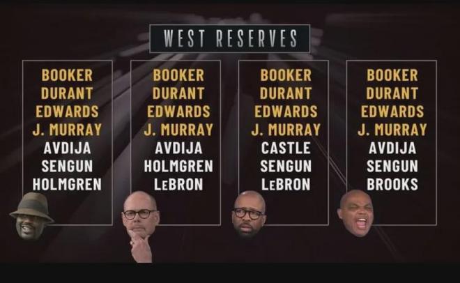 全明星替補陣容是由30支球隊主教練投票選出,TNT天團(tuán)這次投票雖然無法決定倫納德是否入選全明星,但也間接表明了媒體對各個球員的態(tài)度。有四個球員是TNT天團(tuán)四人共同選擇的:布克、杜蘭特、愛德華茲和賈馬爾-穆雷。