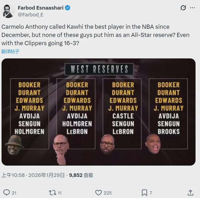 北京時間1月29日,TNT天團(tuán)(奧尼爾、巴克利、肯尼-史密斯和厄尼-約翰遜)選擇全明星西部替補,快船球員倫納德0票??齑浾逨arbod Esnaashari炮轟:“快船過去19場16勝3負(fù),倫納德是過去一個月聯(lián)盟最佳球員,居然沒人選他?”