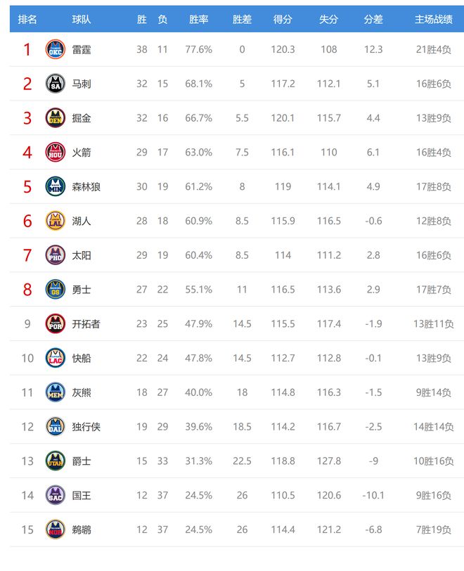 今日比賽后湖人、森林狼排名互換,獨(dú)行俠、灰熊排名互換,其他西部球隊(duì)排名不變。