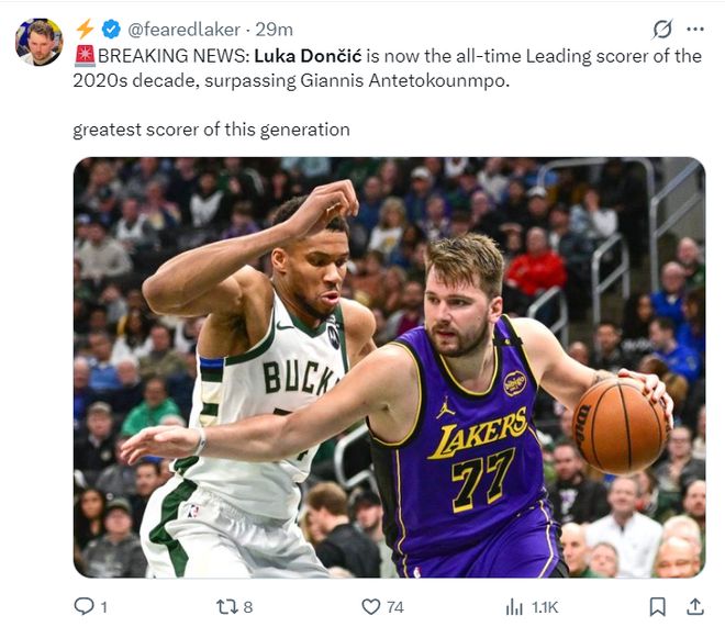 2.憑借上半場拿到的26分,東契奇也超越揚尼斯成為2020年代的新得分王,盧卡-東契奇是真的一代超巨。