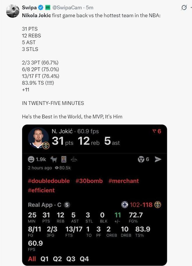 他出戰(zhàn)不到25分鐘便貢獻了31分和12個籃板,這樣的效率直接改變了掘金的進攻層次,也迫使快船隊的防守顧此失彼。