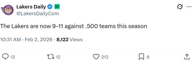 輸給尼克斯之后,湖人本賽季對(duì)陣勝率超過50%的強(qiáng)隊(duì)時(shí),戰(zhàn)績(jī)跌至9勝11負(fù),而對(duì)陣弱旅的戰(zhàn)績(jī)則為20勝8負(fù)。