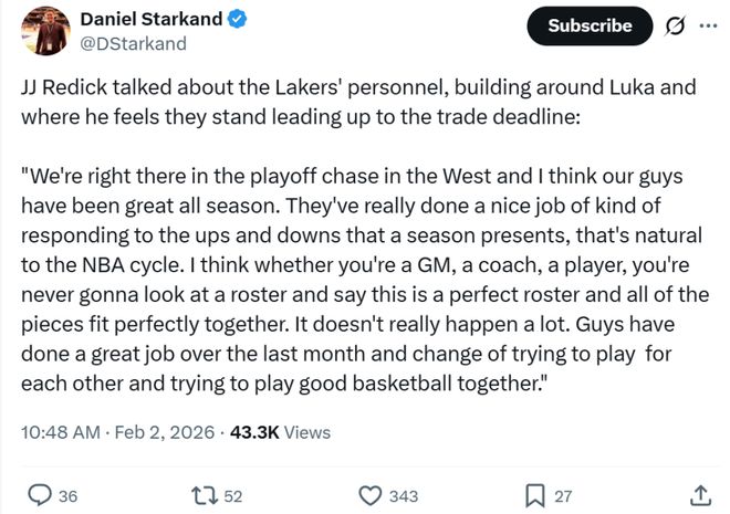并且就目前的情況來看,湖人隊(duì)大概率不會(huì)在截止日前有大手筆的操作,雷迪克賽后被問到相關(guān)問題時(shí)也給出類似答案。