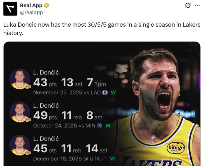 同時(shí)這是東契奇本賽季第27次單場(chǎng)交出至少30+5+5,超越65-66賽季的杰里-韋斯特創(chuàng)造新的湖人隊(duì)史紀(jì)錄。