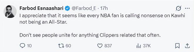 這場比賽后快船記者Fabdod再度提到倫納德落選全明星陣容一事:我很理解,似乎每一位NBA球迷都覺得小卡不入選全明星極度荒謬,很少看到人們因為快船的相關(guān)事情團結(jié)起來。