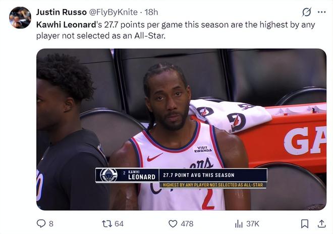 倫納德是NBA歷史上場均得分最高卻落選全明星的球員,他本賽季場均27.7分,快船記者Fabdod曾用‘歷史上最惡劣的冷落’來形容。