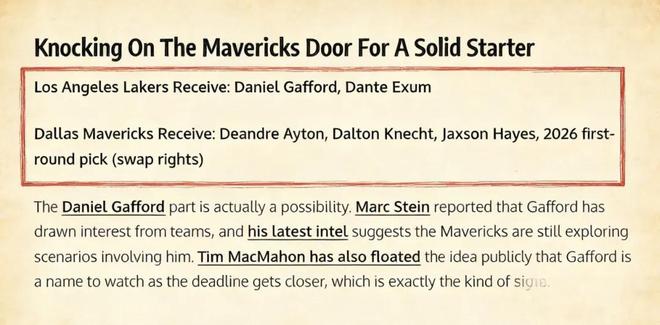 相比之下,湖人更希望引入一位能在防守端穩(wěn)定貢獻(xiàn)的內(nèi)線球員。據(jù)NBA記者Jake Fischer報(bào)道,獨(dú)行俠中鋒加福德正是湖人尋求的替代選項(xiàng),他甚至為湖人設(shè)計(jì)了一套交易方案——