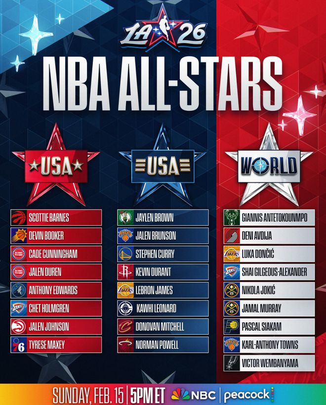 因?yàn)樾】ㄈ脒x全明星后,三支全明星隊伍也就此確定,美國隊是以年齡分兩隊,詹姆斯、杜蘭特、庫里、布朗、布倫森、倫納德、米切爾、鮑威爾在一支球隊。世界隊有9人,