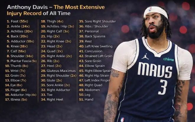 事實(shí)上,傷病一直是都是濃眉職業(yè)生涯揮之不去的陰影。這位32歲球星的傷病史足以列出一份長長的名單。從早期的肩部、膝蓋問題到近年的腳踝、腹股溝和手部傷病,累計(jì)至少遭遇285次傷病,可謂是觸目驚心。