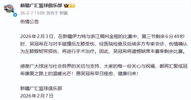 2月7日,新疆男籃官方發(fā)布重磅公告:31歲主力中鋒吳冠希因左膝髕韌帶損傷,將接受手術(shù)治療,遺憾缺席本賽季剩余全部比賽。這一消息如晴天霹靂,擊碎了新疆球迷的賽季希望,也再次將這位CBA最堅韌的內(nèi)線戰(zhàn)士,推入傷病的深淵。