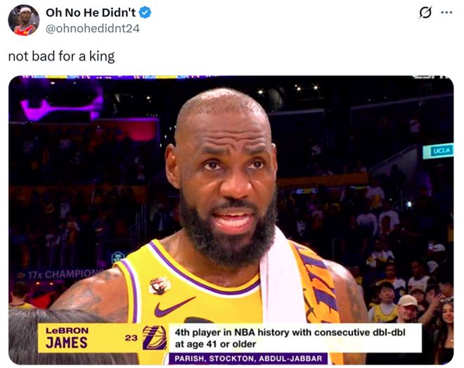 同時(shí)也成為NBA歷史上第四位在41歲后還能連續(xù)兩場(chǎng)交出兩雙的球員,前三人分別是帕里什、斯托克頓和賈巴爾。