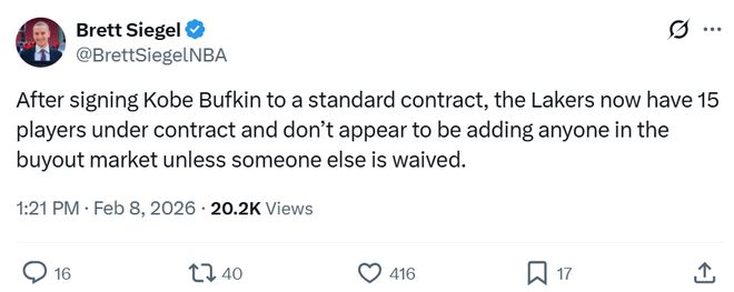 名記Brett Siegel跟進(jìn)表示,這意味著,湖人15人名單滿(mǎn)員,除非是裁掉某個(gè)球員,否則湖人不會(huì)在買(mǎi)斷市場(chǎng)上簽下任何球員。