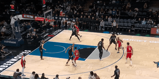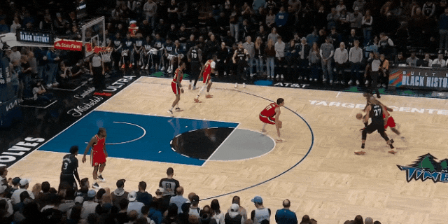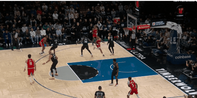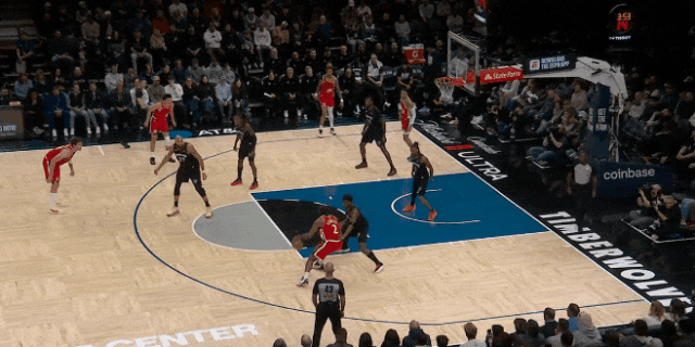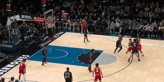 反過(guò)來(lái),愛德華茲開場(chǎng)第一球:找戈貝爾擋拆,被鄧恩貼著保送禁區(qū);洛佩斯無(wú)視戈貝爾,靜等華茲突入,華茲只好滯空拋投——帥氣,但被逼出來(lái)的。
