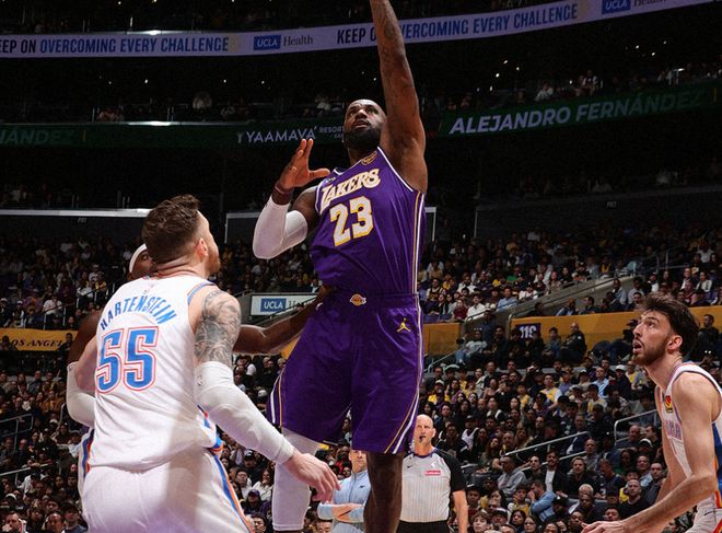 進入下半場,杰威率先上籃,八村塁三分回應(yīng)后,老詹繼續(xù)造殺傷+喂餅斯瑪特,此后老詹繼續(xù)突破上籃,助攻拉拉威亞再中三分球,湖人一波流追上打停雷霆。暫?;貋恚险怖^續(xù)軍訓(xùn)哈騰,拉拉威亞連續(xù)強攻罰球,老詹也續(xù)上單打,湖人最多領(lǐng)先雷霆8分。后半段杰林連拿8分,又輪到雷霆的罰球回合,節(jié)末卡魯索命中三分球,三節(jié)打完,雷霆93-91湖人。決戰(zhàn)第四節(jié),斯瑪特連續(xù)命中三分,卡魯索內(nèi)外開花回應(yīng),中段里夫斯和艾頓輪流失誤,杰威和霍姆格倫繼續(xù)上分。