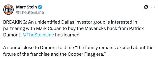北京時(shí)間2月10日,據(jù)名記Stein報(bào)道,一個(gè)未公開(kāi)身份的達(dá)拉斯投資集團(tuán)有意與馬克-庫(kù)班合作,從帕特里克-杜蒙特手中回購(gòu)獨(dú)行俠隊(duì)。