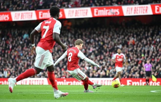 第14分鐘,賴斯中場斷球,薩卡右路突破,禁區(qū)附近低平球傳中,厄德高停球稍作調(diào)整,隨后起腳掃射,皮球從右下角鉆入網(wǎng)窩,阿森納打破僵局,1-0!