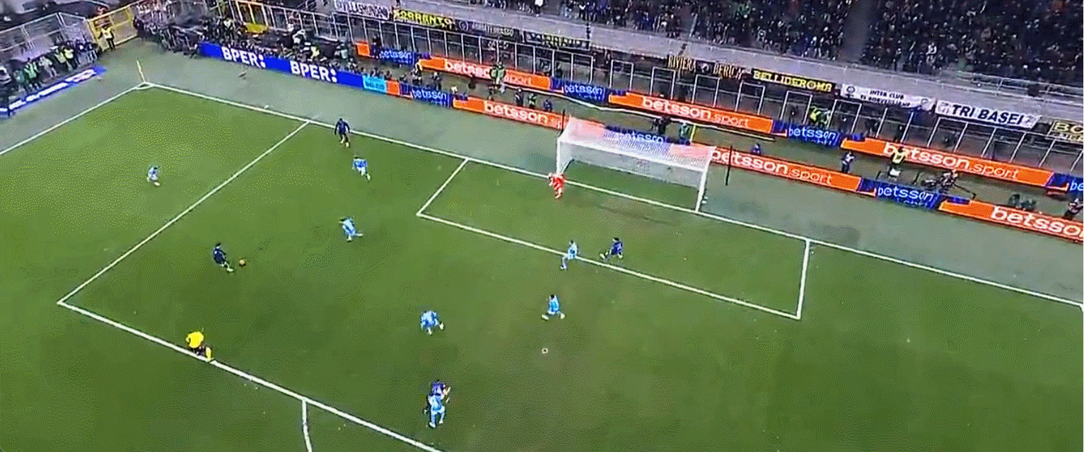 過程如下:補時第2分鐘,皮奧回撤到中場協(xié)助推進,成功轉(zhuǎn)身眼看成反擊之勢,小胡安戰(zhàn)術(shù)犯規(guī)染黃(若非裁判上半場放過了小胡安踹胸之舉,那不勒斯此戰(zhàn)本該少打一人)。隨后國米就勢圍攻,博尼在左邊路對抗取勝后做球,姆希塔良勁射碰后衛(wèi)偏轉(zhuǎn)后打中門框。