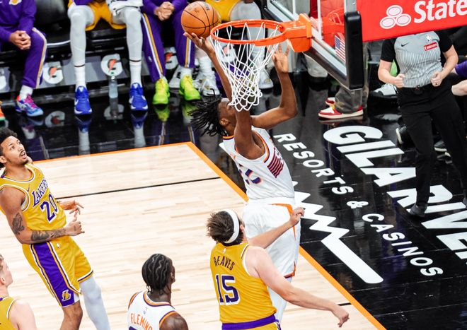 簡單回顧比賽,開場東契奇就軍訓(xùn)馬魯阿奇,艾頓自投自搶,里夫斯行進(jìn)間高拋命中。中段里夫斯帶領(lǐng)拉拉維亞和艾頓上分,東契奇也給艾頓送空接,湖人很快拉開分差。湖人替補(bǔ)被對手追回一些分?jǐn)?shù)后,第二節(jié)中段東契奇和艾頓回來,東契奇喂餅?zāi)峥耸访芩?,隨后里夫斯聯(lián)合東契奇下起三分雨,東契奇手感火熱,帶隊(duì)守住兩位數(shù)領(lǐng)先優(yōu)勢。太陽這邊主要依靠賈里德巴特勒單打強(qiáng)攻,第三節(jié)東契奇和里夫斯內(nèi)外開花,不過當(dāng)東契奇下場后,湖人替補(bǔ)席包括里夫斯還是無法守住優(yōu)勢,第三節(jié)后半段又被太陽反超。