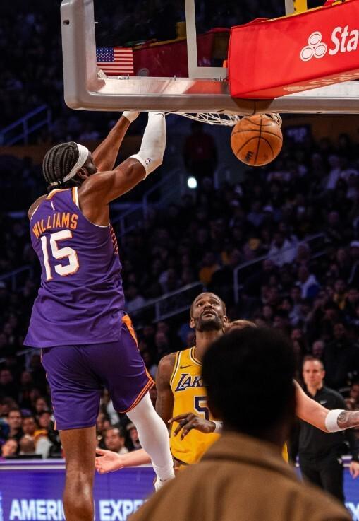 末節(jié)文森特和里夫斯幫助湖人將分差縮小到16分,但此后吉萊斯皮外線連續(xù)三分命中,太陽隊再次取得20分以上的領(lǐng)先。5分44秒湖人撤下主力,本場比賽提前失去懸念。最終全場比賽戰(zhàn)罷,太陽125-108贏下勝利。