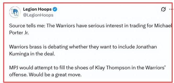 北京時(shí)間1月12日,NBA交易市場(chǎng)的熱度隨著2月6日交易截止日的臨近持續(xù)攀升,而金州勇士隊(duì)的一筆潛在交易傳聞更是成為聯(lián)盟熱議的焦點(diǎn)。據(jù)美媒Legion Hoops報(bào)道,勇士隊(duì)正對(duì)籃網(wǎng)前鋒小邁克爾-波特展開猛烈追逐,管理層已就交易細(xì)節(jié)展開深入磋商。更關(guān)鍵的是,就在今天,一筆涉及勇士、國王與籃網(wǎng)的三方交易框架逐漸清晰,若能順利達(dá)成,將大概率重塑西部競(jìng)爭(zhēng)格局,為庫里沖擊生涯第五冠增添重磅砝碼。