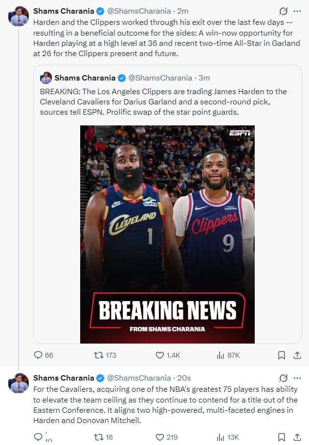 北京時間2月4日,根據(jù)ESPN記者Shams的報道,騎士隊與快船隊達(dá)成重磅交易,快船將哈登送入克利夫蘭換取加蘭、1個次輪簽。