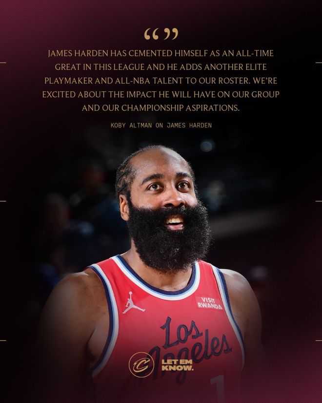 哈登加蘭交易官宣!騎士總裁盛贊助推爭(zhēng)冠 快船官方感謝登哥付出