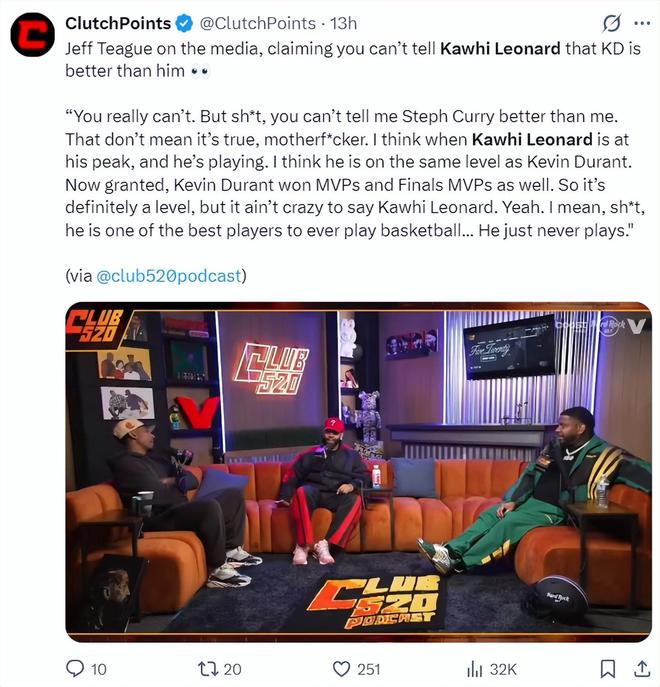 前NBA球員杰夫-蒂格也談到了倫納德本賽季的表現(xiàn),他表示:你們不能說(shuō)凱文-杜蘭特比倫納德更強(qiáng)。倫納德處于巔峰狀態(tài)且健康時(shí),我認(rèn)為他的水平跟杜蘭特是一致的,雖然杜蘭特贏得了MVP與FMVP,所以確實(shí)有一點(diǎn)差距,但說(shuō)倫納德不比他差也不算離譜。我是說(shuō),他真的是NBA歷史上最頂級(jí)的球員之一…… 就是老不打比賽。