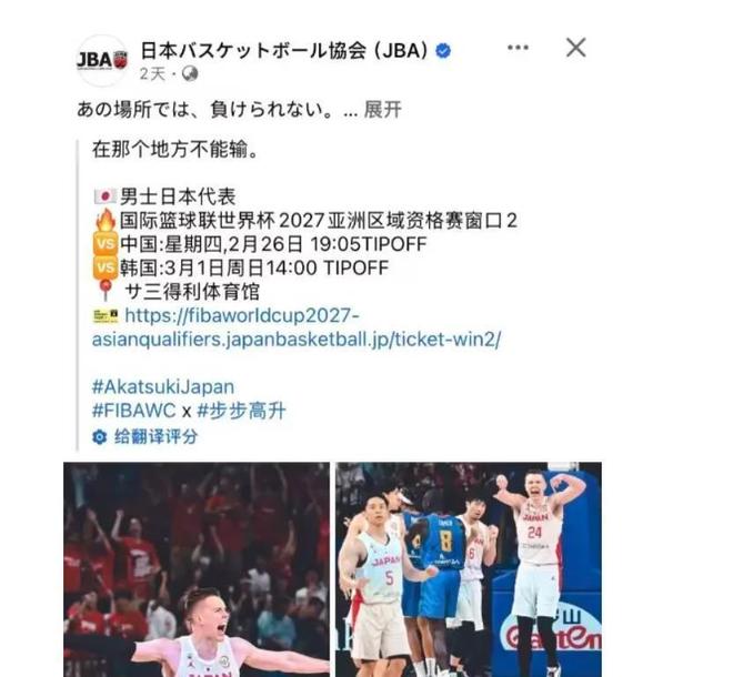 近期日本男籃發(fā)布的公開消息,內容有對陣中國男籃和韓國男籃的時間以及地點,并且說“在那個地方一定不能輸”。男籃世預賽第二階段日本隊主場在琉球沖繩群島,在這里日本隊曾經(jīng)擊敗芬蘭隊,取得了直通奧運會的資格,這里被譽為日本男籃的福地,所以他們這次也是像中國男籃和韓國男籃發(fā)起挑戰(zhàn),還有一些挑釁的意味。