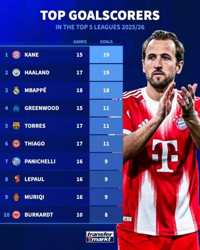 德國轉(zhuǎn)會市場列出了本賽季五大聯(lián)賽射手榜,凱恩、哈蘭德19球居首。本賽季五大聯(lián)賽射手榜: