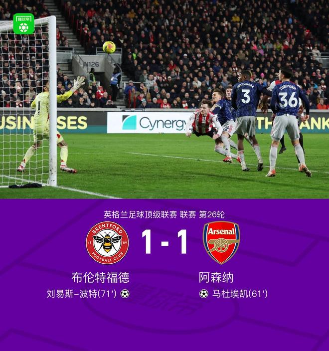 北京時(shí)間2月13日英格蘭足球頂級(jí)聯(lián)賽 聯(lián)賽 第26輪,布倫特福德主場(chǎng)對(duì)陣阿森納。上半場(chǎng)拉亞神撲救險(xiǎn),加布里埃爾、哲凱賴什染黃,下半場(chǎng)馬杜埃凱頭球破門,波特扳平比分,馬丁內(nèi)利失單刀。最終比分布倫特福德 1-1 阿森納。